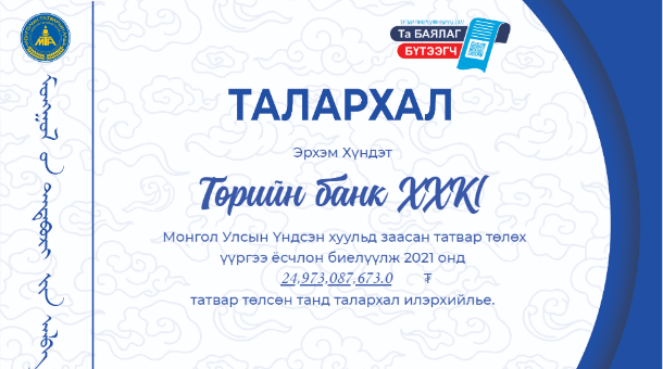 Монгол Улсын арилжааны ТОП5 банкны нэг Төрийн банк Монгол Улсын нийгэм эдийн засагт томоохон хувь нэмэр оруулан 2021 онд 24.9 тэрбум гаруй татвар төлж, улсын төсөвт 15.8 тэрбум гаруй, орон нутгийн төсөвт 9.1 тэрбум гаруй төгрөгийг төвлөрүүлж Монгол Улсын Сангийн яам, Татварын ерөнхий газрын талархлыг хүртжээ.