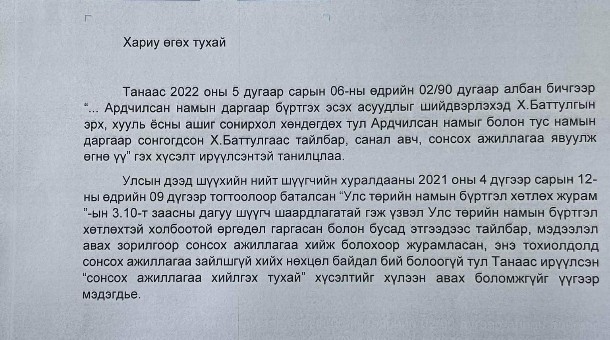 АН-ын Ерөнхий нарийн бичгийн дарга И.Мөнхжаргалд Улсын дээд шүүхээс хариу өгчээ. И.Мөнхжаргал энэ сарын 6-нд АН-ын даргыг бүртгэх эсэх асуудлыг хэлэлцэхэд Х.Баттулгын эрх ашиг хөндөгдөх тул нам болон түүнээс өөрөөс нь тайлбар, санал ав, сонсох үйл ажиллагаа зохион байгуулахыг хүссэн юм.