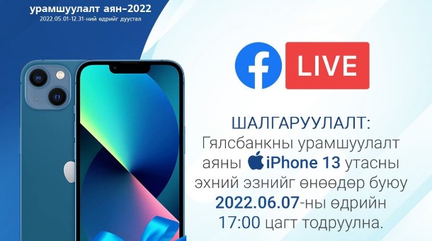 Гялсбанкны урамшуулалт аяны эхний урамшууллын эзнийг энэ сарын 7-ны Мягмар гарагийн 17:00 цагт Төрийн банкны фэйсбүүк хуудсаар тодруулах аж. Гялсбанкаар өөрийн санхүүгээ ГЯЛС шийдээд, IPhone 13 утасны эзэн болоорой.