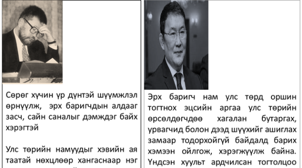 - Бие даасан хүчнүүд адил тэгш хэмжээнд улс орноо хөгжүүлэх асуудлаар дугуй ширээний ярилцлага хийж, цаашдын хөгжлийн чиг баримтлалыг боловсруулах ёстой. Нэг нь нөгөөгөө муулаад, хавчаад, унагаад байх нь зөв зам биш ээ. Ард түмэнд ч, удирдах ажилтнуудад ч улс төрийн соёл дутагдаж байна.