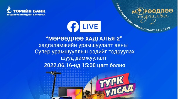 Монгол Улсын өнцөг булан бүрд байрлах Төрийн банкны 500 гаруй салбар нэгжээр явагдсан тус аяны Супер урамшууллын эзэд 2022 оны зургаадугаар сарын 16-ны өдрийн 15.00 цагт Төрийн банкны фэйсбүүк хуудсаар тодрох бөгөөд энэхүү тохирлоор Турк улсад хосоороо аялах, iPhone 13 гар утас, iPad, 1,0 сая төгрөгийн хадгаламжийн эрхийн эзэд тодрох юм.