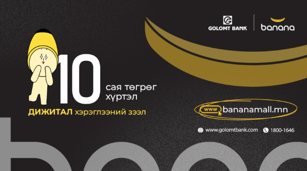 Та хурдан, шуурхай, хялбар нөхцөлөөр хэрэглээний зээл авахыг хүсэж байна уу? Тэгвэл Голомт банк Bananamall.mn-тэй хамтран дижитал хэрэглээний зээлийг олгож эхэллээ. Та өөрт хэрэгцээтэй барааг Bananamall.mn онлайн худалдааны вэбсайтаас сонгоод, Голомт банкны урьдчилгаагүй, бага хүүтэй зээлээр худалдан авах боломжтой боллоо. Та Bananamall.mn вэбсайтаар дамжуулан зээлийн хүсэлтээ онлайнаар илгээх ба бид таны зээлийг 1-10 минутын дотор шийдвэрлэн олгох болно.