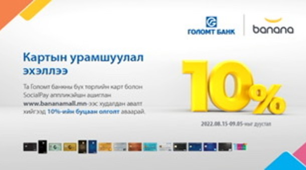 Голомт банк намрын улирлыг угтан ээлжит буцаан олголттой, картын урамшууллаа зарлаж байна. Та https://www.bananamall.mn/ вэбсайтаас онлайн худалдан авалт хийж, Голомт банкны бүх төрлийн Дебит, Кредит болон SocialPay аппликэйшний Виртуал карт ашиглан төлбөрөө төлөөд 10%-ийн буцаан олголт авах боломжтой боллоо.