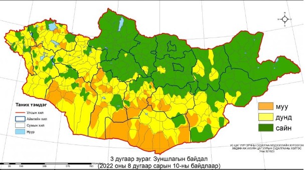 Тодруулбал, Сэлэнгэ, Орхон, Дархан-Уул, Говьсүмбэр, Дорнодын нийт, Архангай, Хөвсгөл, Булган, Төв, Хэнтий, Сүхбаатарын ихэнх, Баян-Өлгий, Увс, Ховд, Говь-Алтай, Баянхонгор, Өвөрхангай, Дундговь, Дорноговийн зарим, Завхан, Өмнөговийн ганц нэг сумдын нутгаар сайн, Увс, Говь-Алтай, Баянхонгор, Өвөрхангай, Өмнөговийн зарим, Баян-Өлгий, Ховд, Завхан, Дундговь, Дорноговийн ганц нэг сумдын нутгаар муу байна.