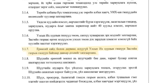 Тус заалтад МАН 2020 оны сонгуулийн мөрийн хөтөлбөрийн 3.1.7 доо “ЕС болон 4-өөс илүүгүй УИХГ ЗГ гишүүн байхаар давхар дээлийг хязгаарлана” гэж амлаад сонгуульд ялсан байна. Өчигдөр Үндсэн Хууль өөрчилж давхар дээлээ хязгаарлахаа болиод 22 сайдтай Засгийн газар байгууллаа. Ардчилсан засаглалтай улсуудтай харьцуулахад Монгол Улсын Засгийн газар маш тогтворгүй байсаар ирсэн бөгөөд Шударга ёсны засаглал хэмээн нэрлэсэн 3.1 дүгээр заалтад тодруулбал 3.1.7- дахь заалтаа МАН ийнхүү мартжээ.