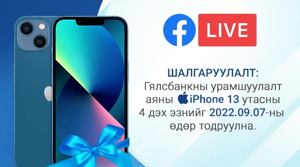 Цахим эринд амьдарч буй өнөө цагт Төрийн банк нь Гялсбанк үйлчилгээгээ харилцагчдынхаа хэрэгцээнд бүрэн нийцүүлэн, улам хөгжүүлэн ажилласаар байна. Та замын түгжээнд цаг алдалгүй, банканд очиж дараалал хүлээхгүйгээр алтан цагаа хэмнэхийн зэрэгцээ Гялсбанкны урамшуулалт аяндаа оролцон iPhone13 утасны эзэн болоорой.