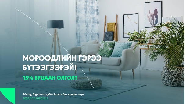 ХААН Банкнаас Priority, Signature дебит болон бүх төрлийн кредит карт эзэмшигчдэдээ зориулсан ээлжит буцаан олголттой урамшууллыг өнөөдрөөс эхлүүллээ. Хэрэв харилцагч танд эдгээр картын аль нэг нь байгаа бол 2022.11.12-2022.12.12-ны өдрийг дуустал Gerplace тавилгын их дэлгүүрээр үйлчлүүлэн худалдан авалтын үнийн дүнгийн 15%-д буцаан олголт (cashback) авах боломжтой юм. Өөрөөр хэлбэл, аяны хугацаанд та 1,000,000-3,000,000 төгрөгийн худалдан авалт хийгээд 150,000-450,000 төгрөг буцаан олголт авах боломжтой гэсэн үг.