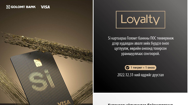 Бүтээгчдэд зориулсан Si картын 1 жилийн ойн бэлэг “Loyalty” оноотой хөтөлбөрөөр үргэлжилж байна. Та 2022.12.31-нийг дуустал Si картаар төлбөр, тооцоо хийх бүрдээ оноо цуглуулаад уг хөтөлбөрт хамтран ажиллаж буй худалдаа, үйлчилгээний байгууллагуудаар үйлчлүүлэх бэлгийн купоноо аваарай. Купоны тоо хязгаартай тул амжиж оноогоо цуглуулаад, урамшуулалд хамрагдахыг зөвлөж байна.
