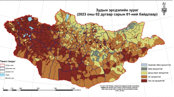 Ус цаг уур, орчны судалгаа мэдээллийн хүрээлэнгээс ган зуншлага, цас зуд, бэлчээртэй холбоотой газрын ажиглалтын болон хиймэл дагуулын олон төрлийн мэдээг нэгтгэн боловсруулж, зудын эрсдэлийн зургийг гаргажээ.