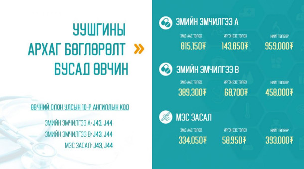 ЭМДҮЗ-ийн 2022 оны 01 дүгээр тогтоолоор уушгины архаг бөглөрөлт болон бусад өвчний эмийн эмчилгээг 458 - 959 мянган төгрөг, мэс заслын тусламж үйлчилгээг 393 мянган төгрөг байхаар зохицуулсан бөгөөд үүний 15 хувийг иргэн өөрөө хариуцан төлнө.