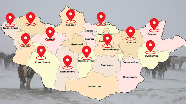 Харин Баян-Өлгийн Булган, Увсын Малчин, Улаангом, Сагил, Баруунтуруун, Говь-Алтайн Хөхморьт, Завханы Баянхайрхан, Улиастай, Тосонцэнгэл, Цэцэн-Уул, Сантмаргац, Сонгино, Баянтэс, Яруу, Түдэвтэй, Баянхонгорын Галуут, Архангайн Хангай, Цахир, Өвөрхангайн Хархорин, Есөнзүйл, Хужирт, Хөвсгөлийн Алаг-Эрдэнэ, Цагаан-Үүр, Цэцэрлэг, Ренчинлхүмбэ, Сэлэнгийн Хүдэр, Хушаат, Түшиг, Ерөө, Сүхбаатар, Төвийн Алтанбулаг, Угтаалцайдам, Баян, Улаанбаатарын Багануур, Хэнтийн Жаргалтхаан, Баян-Овоо, Өмнөдэлгэр, Цэнхэрмандал, Сүхбаатарын Дарьганга, Дорнодын Хэрлэн, Булган Халхголд зузаан цастайн улмаас цагаанаар зудархуу байна.