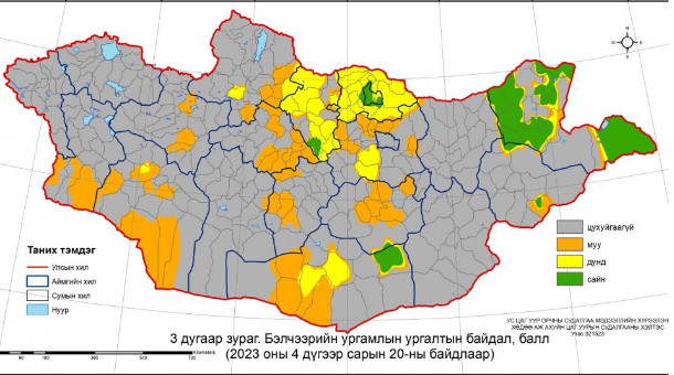 Цаг уурын байгууллагын ирүүлсэн мэдээгээр бэлчээрийн ургамлын ургалтын байдал 4 дүгээр сарын 20-ны байдлаар нийт нутгийн 70 гаруй хувьд цухуйгаагүй. Ховд, Говь-Алтай, Завхан, Архангай, Өвөрхангай, Хөвсгөл, Булган, Төв, Өмнөговь, Дундговь, Сүхбаатарын зарим сумдын нутгаар муу буюу ургамал цухуйсан боловч мал бэлчээх боломжгүй.