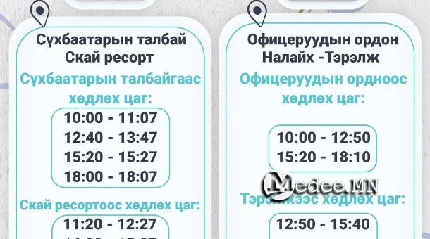 Тус чиглэлийн автобус 10:00 цагт Сүхбаатарын талбайгаас зорчигчдоо хүлээн авч дээрх чиглэлд үйлчилгээ үзүүлж байна. Иргэд Офицеруудын ордноос Тэрэлж чиглэлд зорчих бол том хүн 2300, хүүхэд 1200 төгрөгөөр, Сүхбаатарын талбайгаас “Скай ресорт” чиглэлд том хүн 1000, хүүхэд 500 төгрөг төлж зорчино.