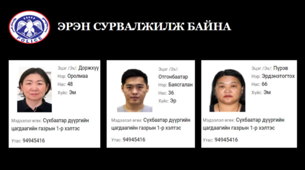 Эдгээр этгээдийг Сүхбаатар дүүргийн шүүхээс эрэн сурвалжлах тухай шийдвэр гарч, Цагдаагийн ерөнхий газраас эрэн сурвалжлах ажиллагааг гүйцэтгэн, цахим хуудастаа дээрх зургийг байршуулжээ.