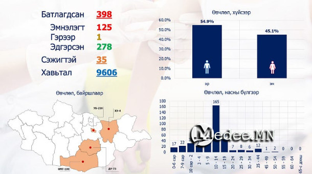 Өнөөдөр буюу 2025 оны 4 дүгээр сарын 08-ны байдлаар нийт улаанбурхан өвчний лабораториор батлагдсан 398, эмнэлэгт хэвтэн эмчлүүлж байгаа 125, гэрээр 1, эдгэрсэн 278, сэжигтэй тохиолдол нь 35, Хавьтал 9606 байгаа аж.