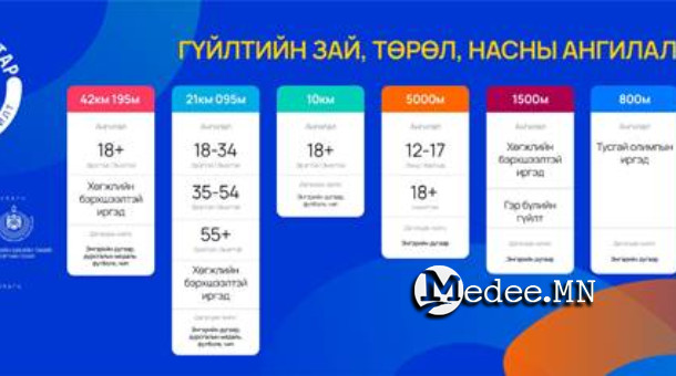 Харин 42 км, 21 км, 10 км-ийн зайд оролцогчдын энгэрийн дугаар, чип, футболк, мөн 1.5 км зайд оролцогчдын баталгаажуулалт, энгэрийн дугаар олгох ажлыг нийслэлийн Биеийн тамир, спортын газар хариуцах бол 500, 800 м-ийн гүйлтийн бүртгэлийг Монголын тусгай олимпын хороо хариуцан олгох хугацаагаа жич мэдэгдэх юм.