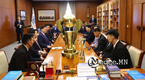 Монгол Улсын Ерөнхийлөгч Ухнаагийн Хүрэлсүх Монголын сагсан бөмбөгийн холбооны Үндэсний дээд лигийн есөн удаагийн аварга “Хасын хүлэгүүд” багийн бүрэдлэхүүнийг хүлээн авч уулзлаа.