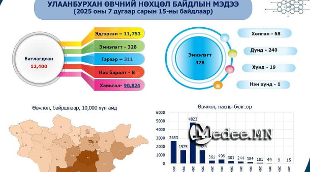 Халдварт өвчин судлалын үндэсний төвөөс гаргасан мэдээллээр, 2025 оны долдугаар сарын 15-ны байдлаар улаанбурхан өвчний нийт батлагдсан тохиолдол 12400 хүрээд байна.