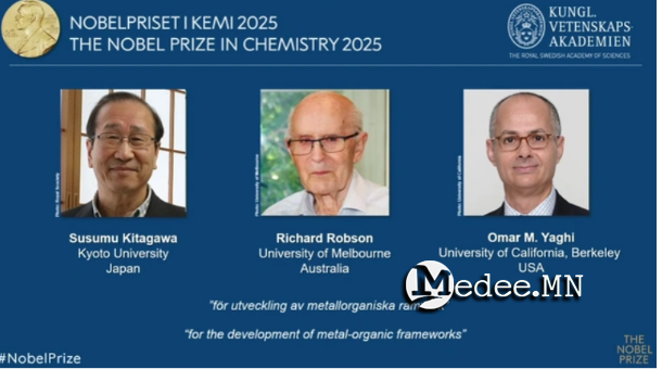 Японы химич Китагава Сусумү, Америкийн химич Ричард Робсон, Омар М.Яги нар энэ оны химийн салбарын Нобелийн шагналын эздээр тодорлоо. Энэхүү шагналыг металлорганикийн шинэ нэгдлүүдийг үүсгэснийх нь төлөө тэдэнд олгохоор шийдвэрлэжээ.