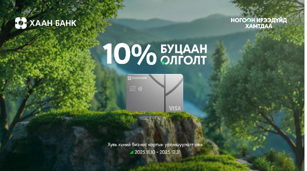 Виза бизнес дебит картыг шинээр захиалан авсан харилцагчдадаа зориулан бид 2025 оны 11-р сарын 10-ны өдрөөс 12-р сарын 31-ний өдрийг дуусталх хугацаанд сонгогдсон дараах нэр бүхий худалдаа үйлчилгээний байгууллагуудын ПОС төхөөрөмжид картаа уншуулан худалдан авалт тутмынхаа 10%-ийг буцаан олголт хэлбэрээр авах урамшуулалт аяныг зарлалаа. Жишээ нь, та дээрх хугацаанд аль нэг сонгогдсон байгууллагын ПОС төхөөрөмжид Виза бизнес дебит картаа уншуулан 300,000 төгрөгийн гүйлгээ хийсэн тохиолдолд таны данс руу 30,000 төгрөгийн буцаан олголт орох юм.
