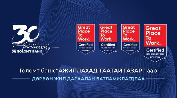Голомт банк олон улсад хүлээн зөвшөөрөгдсөн “Ажиллахад таатай газар”-аар дөрөв дэх жилдээ батламжлагдлаа. Ажилтнуудынхаа итгэлцэл, хүндлэл, нөхөрлөл, бахархал, шударга байдал, хамтын ажиллагаанд тулгуурласан ажлын орчныг бүрдүүлэн ажилладаг Голомт банк анх 2022 онд Монгол Улсын банк санхүүгийн салбараас түүчээлэн “Ажиллахад таатай газар”-аар батламжлагдсан түүхтэй. 2023, 2024 онд ажиллахад таатай газар гэдгээ олон улсад гурван жил дараалан баталгаажуулсан бол 2025 онд дахин батламжлагдсанаар жил бүр соёлын индексийн үр дүнгээ тогтмол өсгөж буй Монгол Улсын анхны байгууллага болж байна.
