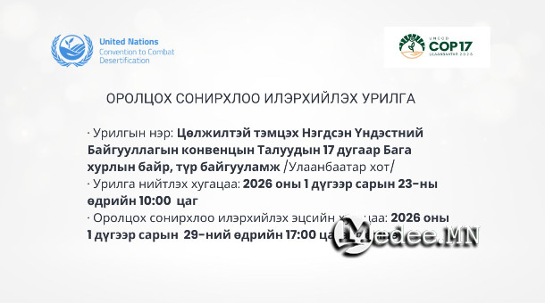 Монгол Улсын Засгийн газар нь 2026 оны наймдугаар сарын 17-28-ны өдрүүдэд Цөлжилттэй тэмцэх НҮБ-ын конвенцын Талуудын 17 дугаар Бага хурлыг (UNCCD COP17) зохион байгуулахаар бэлтгэж байна.