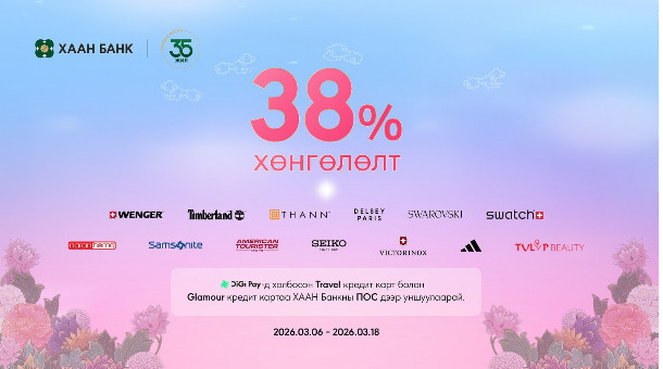 Тодруулбал, ХААН Банк Travel болон Glamour кредит карт эзэмшигч харилцагчдадаа зориулан 2026 оны 3-р сарын 6-наас 18-ны өдрийг дуустал сонгогдсон байгууллагуудаар үйлчлүүлэхдээ 38 хувийн хөнгөлөлт эдлэх онцгой боломжийг бүрдүүллээ.
